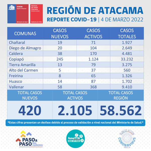 Este viernes 04 de marzo se reportan 420 nuevos casos positivos de Coronavirus en la región de Atacama. 245 casos corresponden a la comuna de Copiapó, 58 casos a la comuna de Vallenar, 38 casos a la comuna de Caldera, 20 casos a la comuna de Diego de Almagro, 19 casos a la comuna de Chañaral, 14 casos para la comuna de Huasco, 13 casos para Tierra Amarilla, 8 casos para Freirina y 5 casos para Alto del Carmen.