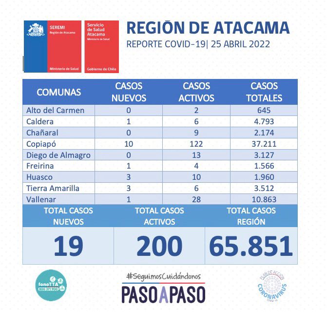 Este lunes 25 de abril se reportan 19 nuevos casos positivos de Coronavirus en la región de Atacama. 10 casos corresponden a la comuna de Copiapó, 3 casos para la comuna de Huasco y Tierra Amarilla, y finalmente 1 caso a la comuna de Caldera, Freirina y Vallenar.