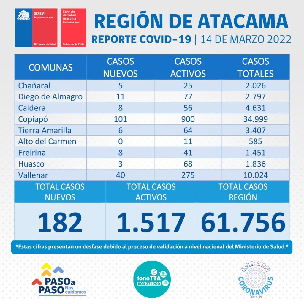 Este lunes 14 de marzo se reportan 182 nuevos casos positivos de Coronavirus en la región de Atacama. 101 de los casos corresponden a la comuna de Copiapó, 40 casos a la comuna de Vallenar, 11 casos a la comuna de Diego de Almagro, 8 casos a la comuna de Caldera, 8 casos a la comuna de Freirina, 6 casos a la comuna de Tierra Amarilla, 5 casos a la comuna de Chañaral y finalmente 3 casos corresponden a la comuna de Huasco.