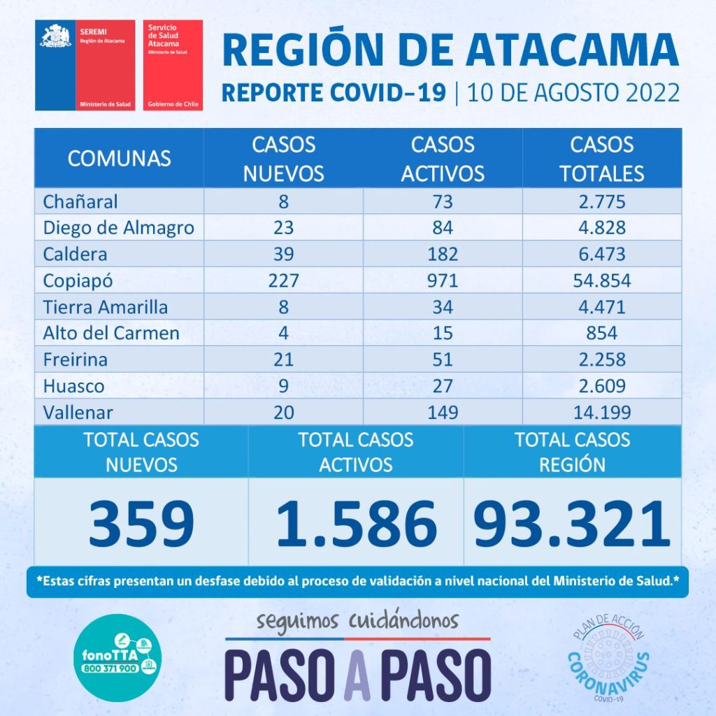 Este miércoles 10 de agosto se reportan 359 nuevos casos positivos de Coronavirus en la región de Atacama. 227 casos corresponden a la comuna de Copiapó, 39 casos a la comuna de Caldera, 23 casos a la comuna de Diego de Almagro, 21 casos a la comuna de Freirina, 20 casos a la comuna de Vallenar, 9 casos a la comuna de Huasco, 8 casos a la comuna de Tierra Amarilla, 8 casos a la comuna de Chañaral y finalmente 4 casos a la comuna de Alto del Carmen.
