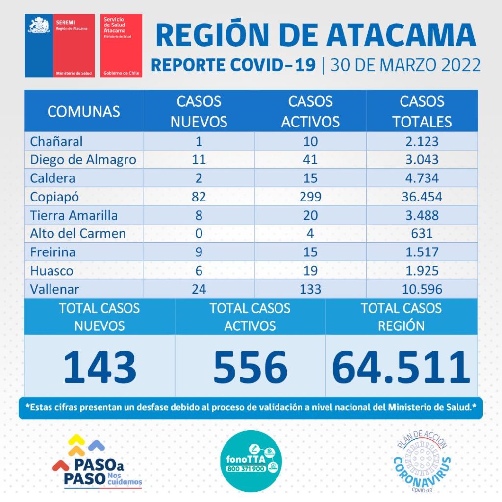 Este miércoles 30 de marzo se reportan 143 nuevos casos positivos de Coronavirus en la región de Atacama. 82 casos corresponden a la comuna de Copiapó, 24 casos a la comuna de Vallenar, 11 casos a la comuna de Diego de Almagro, 9 casos a la comuna de Freirina, 8 casos a la comuna de Tierra Amarilla, 6 casos a la comuna de Huasco, 2 casos a la comuna de Caldera, y 1 caso a la comuna de Chañaral.