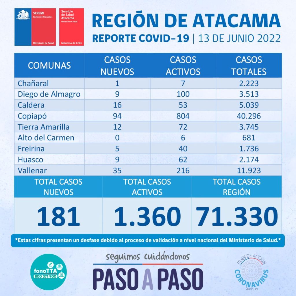 Este lunes 13 de junio se reportan nuevos 181 casos positivos de Coronavirus en la región de Atacama. 94 casos corresponden a la comuna de Copiapó, 35 casos a la comuna de Vallenar, 16 casos a la comuna de Caldera, 12 casos a la comuna de Tierra Amarilla, 9 casos a la comuna de Diego de Almagro, 9 casos a la comuna de Huasco, 5 casos a la comuna de Freirina, y 1 caso a la comuna de Chañaral.