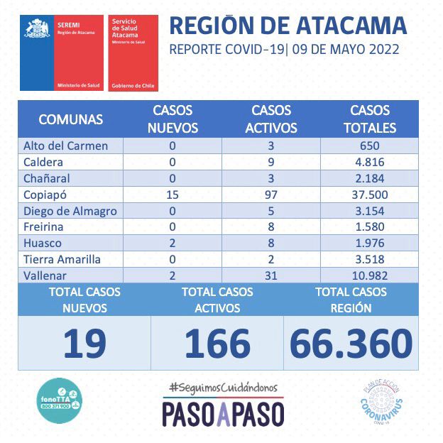 Este lunes 09 mayo se reportan nuevos 19 casos positivos de Coronavirus en la región de Atacama. 15 casos corresponden a la comuna de Copiapó, 2 casos a la comuna de Huasco, y 2 casos a la comuna de Vallenar.