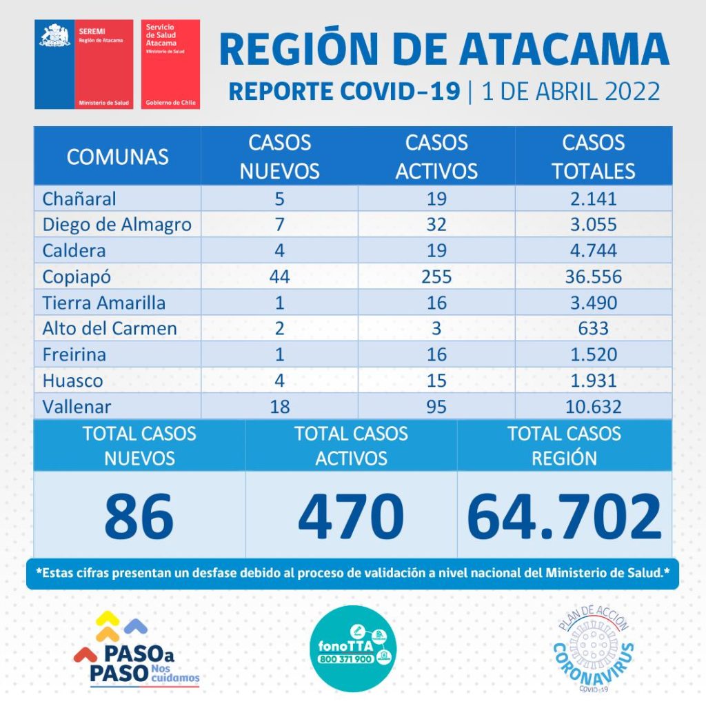 Este lunes 11 de abril se reportan 30 nuevos casos positivos de Coronavirus en la región de Atacama. 19 casos corresponden a la comuna de Copiapó, 3 casos a la comuna de Vallenar, 3 casos a la comuna de Caldera, 2 casos a la comuna de Freirina, 1 caso a la comuna de Chañaral, 1 caso a la comuna de Diego de Almagro y