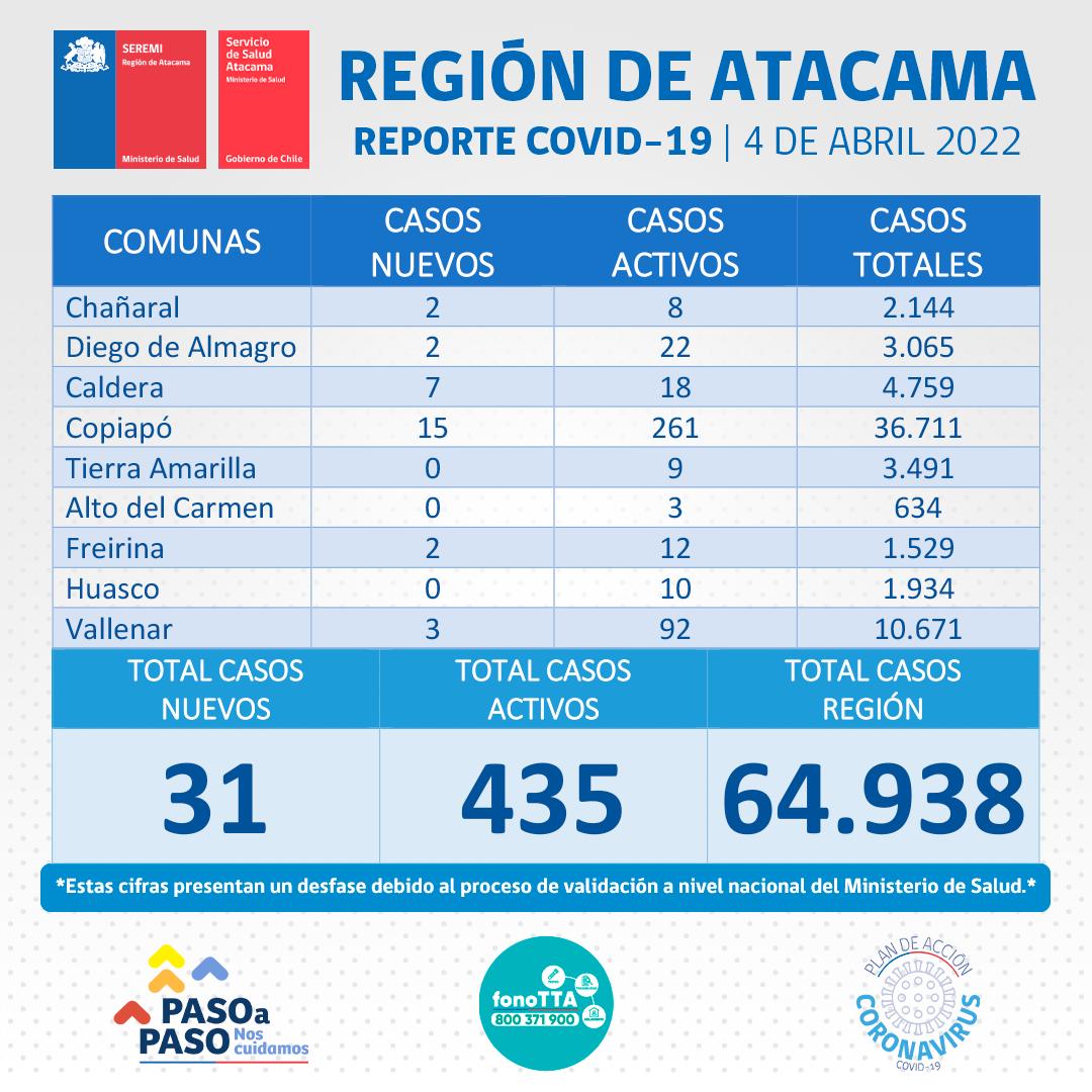Este lunes 04 abril se reportan 31 nuevos casos positivos de Coronavirus en la región de Atacama. 15 casos corresponden a la comuna de Copiapó, 7 casos a la comuna de Caldera, 3 casos a la comuna de Vallenar, 2 casos a la comuna de chañaral, 2 casos a la comuna de Diego de Almagro, y 2 casos a la comuna de Freirina.