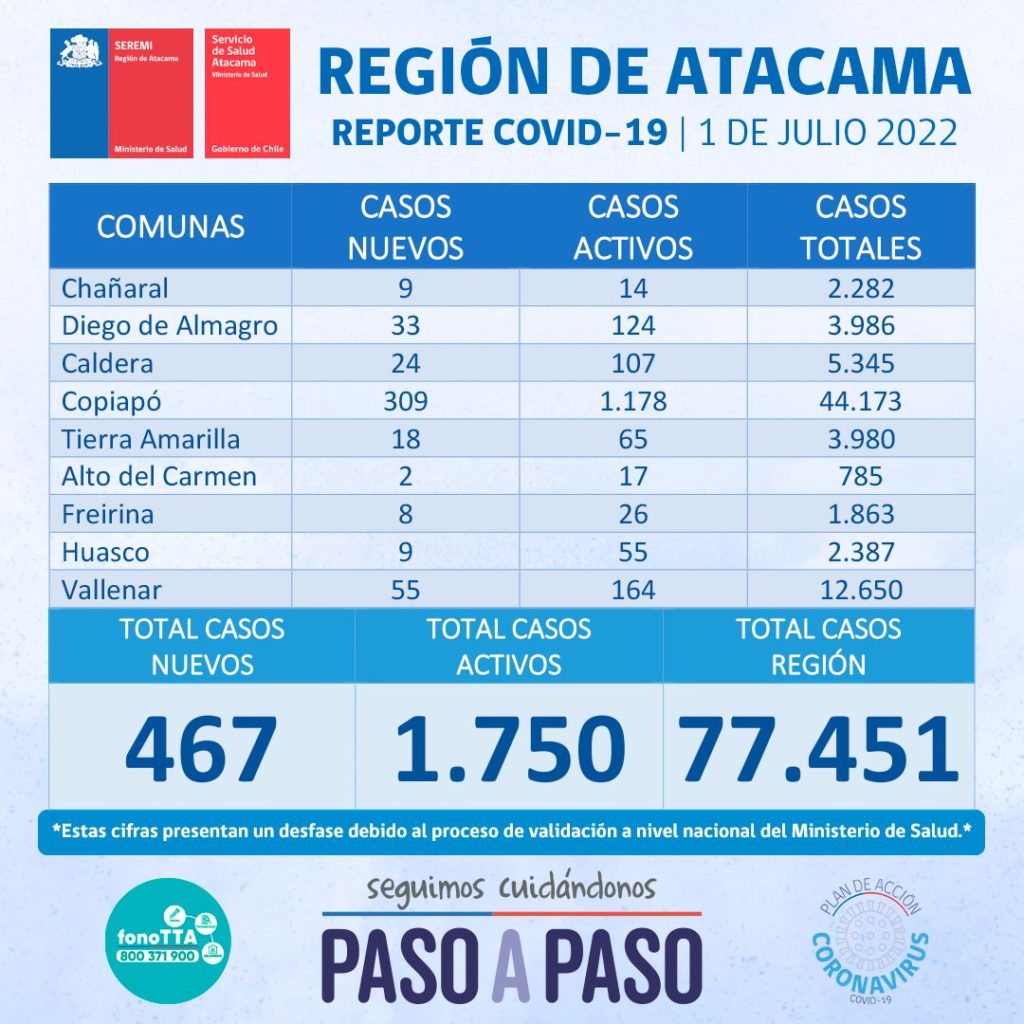 Este viernes 1 de julio se reportan 467 nuevos casos positivos de Coronavirus en la región de Atacama. 309 casos corresponden a la comuna de Copiapó, 55 casos a la comuna de Vallenar, 33 casos a la comuna de Diego de Almagro, 24 casos a la comuna de Caldera, 18 casos a la comuna de Tierra Amarilla, 9 casos a la comuna de Chañaral, 9 casos a la comuna de Huasco, 8 casos a la comuna de Freirina y finalmente 2 casos a la comuna de Alto del Carmen.
