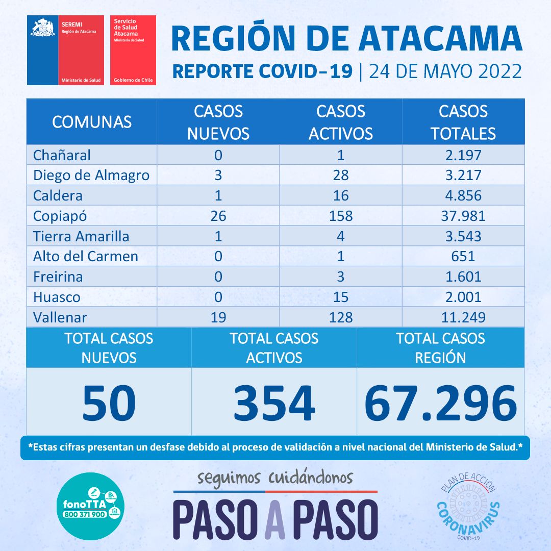 Este martes 24 de mayo se reportan 50 nuevos casos positivos de Coronavirus en la región de Atacama. 26 casos corresponden a la comuna de Copiapó, 19 casos a la comuna de Vallenar, 3 casos a la comuna de Diego de Almagro, 1 caso a la comuna de Caldera y finalmente 1 caso a la comuna de Tierra Amarilla.