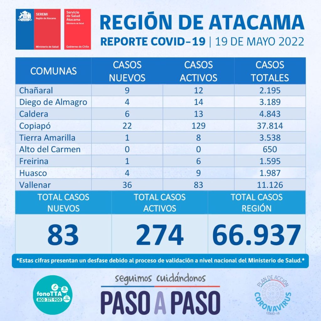 Este jueves 19 de mayo se reportan 83 nuevos casos positivos de Coronavirus en la región de Atacama. 36 casos corresponden a la comuna de Vallenar, 22 casos a la comuna de Copiapó, 9 casos a la comuna de Chañaral, 6 casos a la comuna de Caldera, 4 casos a la comuna de Diego de Almagro, 4 casos a la comuna de Huasco, 1 caso a la comuna de Freirina y finalmente 1 caso a la comuna de Tierra Amarilla.