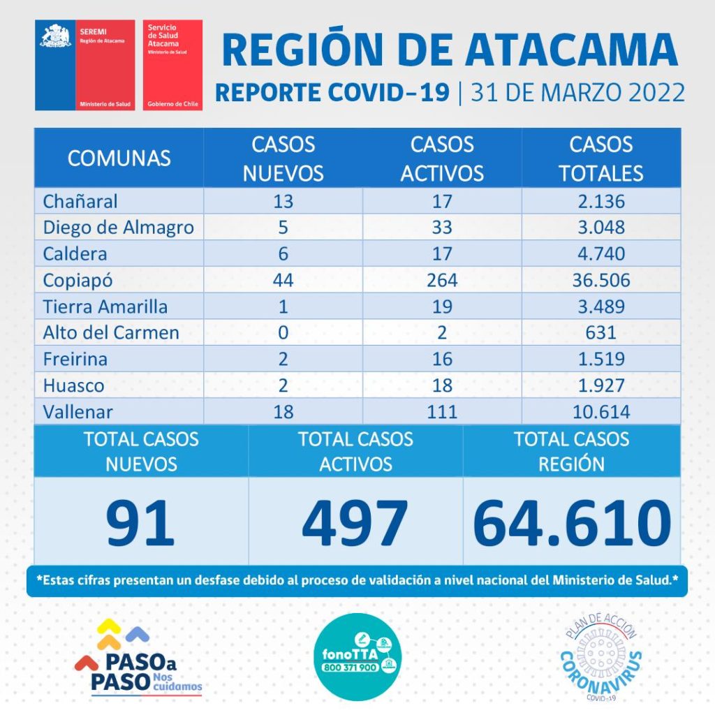 Este jueves 31 de marzo se reportan 91 nuevos casos positivos de Coronavirus en la región de Atacama. 44 casos corresponden a la comuna de Copiapó, 18 casos a la comuna de Vallenar, 13 casos a la comuna de Chañaral, 6 casos a la comuna de Caldera, 5 casos a la comuna de Diego de Almagro, 2 casos a la comuna de Freirina, 2 casos a la comuna de Huasco, y 1 caso a la comuna de Tierra Amarilla.