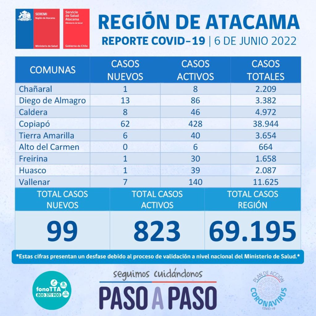 Este lunes 6 de junio se reportan 99 nuevos casos positivos de Coronavirus en la región de Atacama. 62 casos corresponden a la comuna de Copiapó, 13 casos a la comuna de Diego de Almagro, 8 casos a la comuna de Caldera, 7 casos a la comuna de Vallenar, 6 casos a la comuna de Tierra Amarilla, y finalmente 1 caso a la comuna de Chañaral, Huasco y Freirina.