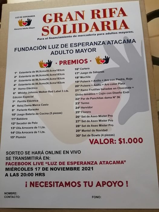 Hoy miércoles, a contar de las 20.00 horas se realizará el sorteo en vivo de la Gran Rifa Solidaria que ha organizado la Fundación ‘Luz de Esperanza Atacama Adulto Mayor’