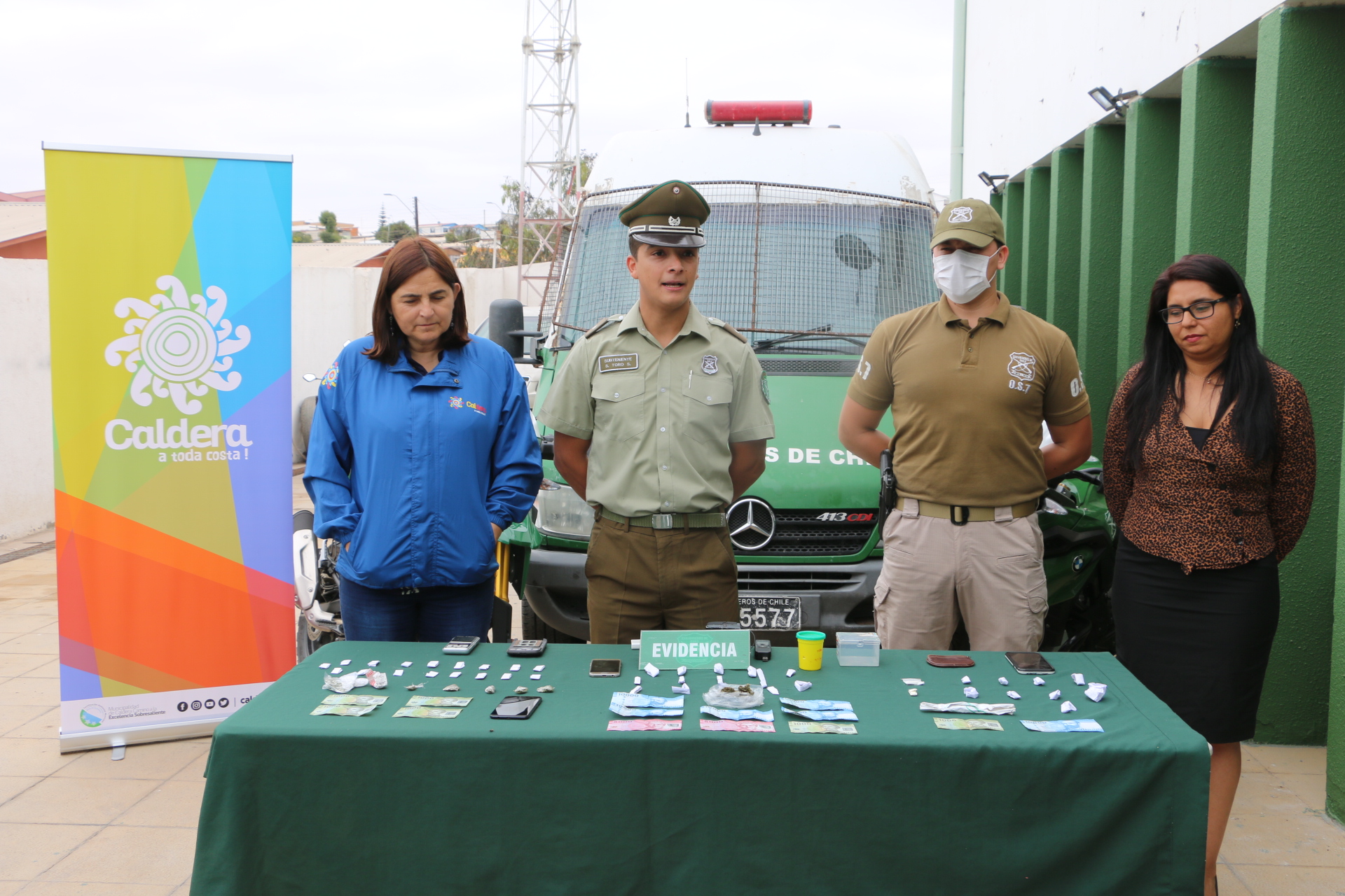 En un trabajo conjunto entre de Carabineros a través de su Departamento OS-7 y la Fiscalía de la comuna de Caldera  se logró incautar una importante cantidad de drogas entre marihuana prensada, clorhidrato de cocaína y pasta base de cocaína, además de especies y dinero en efectivo.