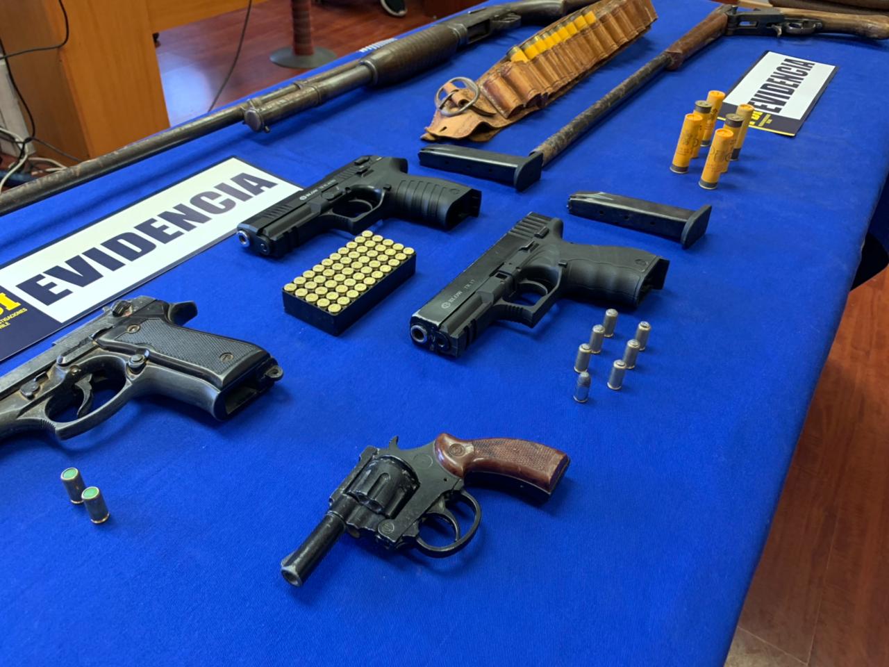 La operación “Fuego Cruzado” permitió incautar dos armas de fuego tipo escopeta, 01 arma de fuego tipo pistola con su cañón modificado, es decir adaptada para el disparo la que mantenía un cargador con munición de fogueo modificada apta para ser percutida, 01 revólver de fogueo calibre 22, con su cañón modificado, aparentemente apto para el disparo y 02 armas de fogueo, calibre 8mm y 9mm, con munición de fogueo, dispuestas para ser adaptadas para el disparo, además de 16 cartuchos escopeta calibre 20, 7 cartuchos 9mm, modificados para proyectar munición y 52 cartuchos de fogueo 9mm.