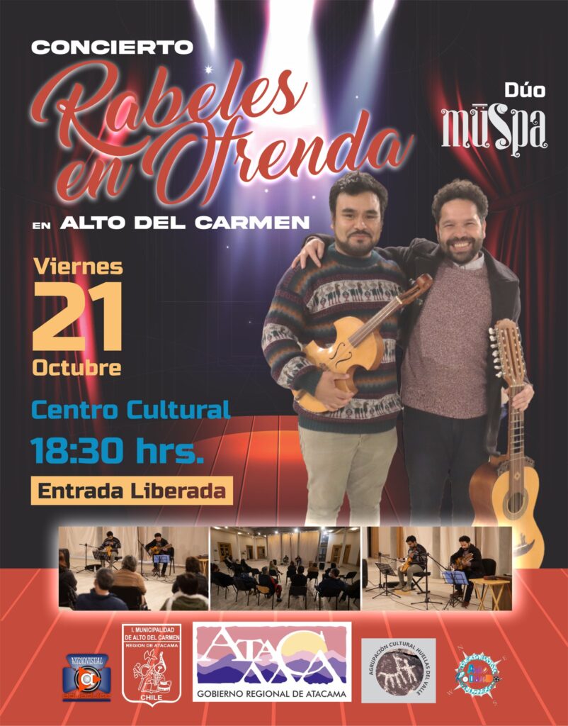 La Municipalidad de Alto del Carmen está invitando para este día 21 de octubre a las 18:30 horas. en el Centro Cultural de la comuna al Concierto del dúo Muspa (música para el alma). En este encuentro musical se disfrutará de piezas musicales de folclore contemporáneo y décimas tradicionales inspiradas en los elementos identitarios de la Región de Atacama.