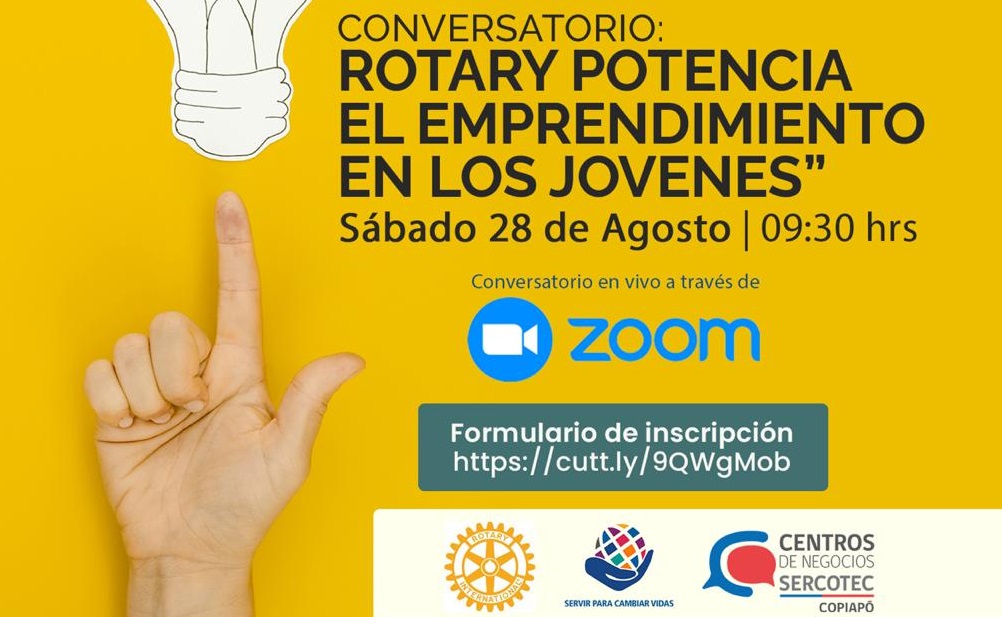 Con el objetivo fundamental de mostrar de forma rápida y visual la posibilidad que tienen hoy los jóvenes de convertirse en emprendedores y los apoyos que pueden encontrar para ello, este sábado 28 de agosto del 2021 se realizará el Conversatorio “Rotary Potencia el Emprendimiento de los Jóvenes”, en una actividad organizada por el Centro de Negocios SERCOTEC Copiapó y Rotary – Distrito 4320 y su equipo de Programas de Rotary.
