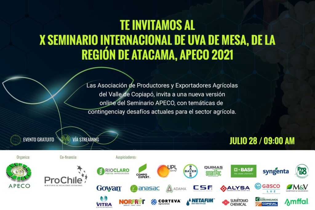 Uno de los sectores más importantes en la cadena exportadora de Atacama es la uva de mesa, con una producción que llega a decenas de mercados internacionales. En ese sentido, la Asociación de Productores y Exportadores Agrícolas del Valle de Copiapó, APECO A.G., en conjunto con ProChile, invitan al Seminario Internacional de Uva de Mesa de la Región de Atacama, actividad que se realizará este 28 de Julio vía streaming y en una versión digital muy acorde a los tiempos de pandemia.