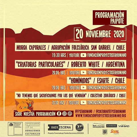 Desde el 18 al 28 de noviembre, se desarrolla el 4to Festival Itinerante de Artes Escénicas de Atacama, Organizado por Fundación Proyecto Ser Humano es una actividad que transmite y publica obras de destacadas compañías locales, nacionales e internacionales, con funciones vía streaming, cápsulas audiovisuales, talleres y conversatorios.