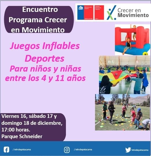 Este viernes, sábado y domingo, el Programa formativo «Crecer en Movimiento» del Mindep-IND Atacama, realizará nuevamente un Encuentro para niños y niñas de entre 4 y 11 años de edad, donde habrán actividades deportivas y recreativas que ayudarán a fomentar la Cultura del Movimiento que promueve el Ministerio del Deporte de Chile.
