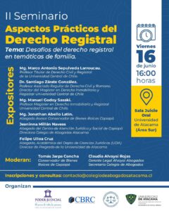 El análisis de este y otros temas relacionados con el derecho de familia y nuestro sistema registral inmobiliario, serán tratados en profundidad en el II Seminario de aspectos prácticos de derecho registral, que se llevará a cabo el viernes 16 de junio, en la sala de juicio oral de la escuela de derecho de la Universidad de Atacama, desde las 16 horas.