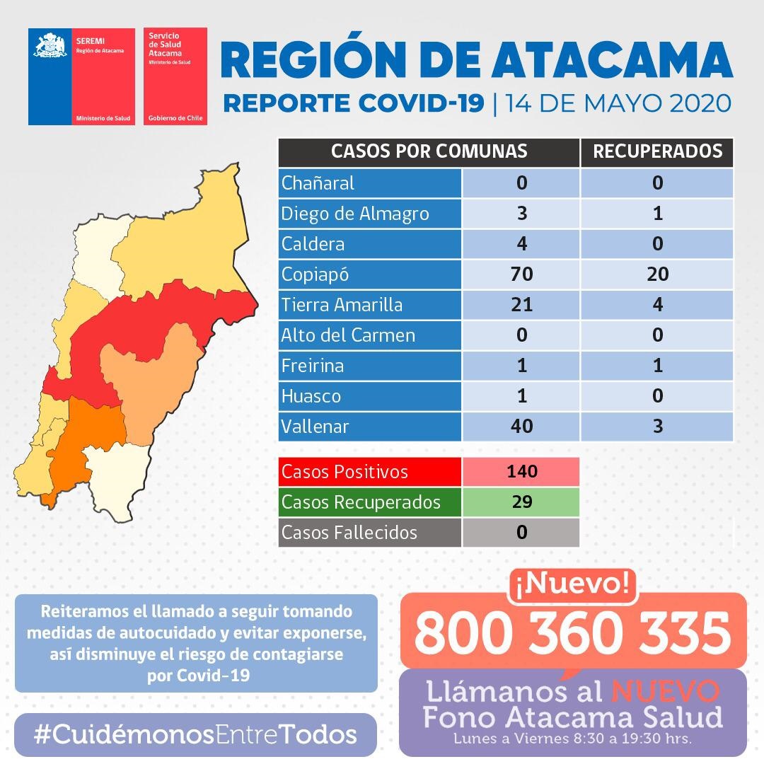 El muestreo que se hizo durante la jornada del miércoles permitió detectar a dos nuevas personas con coronavirus en la Región Atacama para un total de 140 contagiados, de los cuales 29 recibieron el alta médica tras “ser evaluados por nuestro equipo de visita domiciliaria” según informó el director del Servicio de Salud, Claudio Baeza, y 111 siguen activos.
