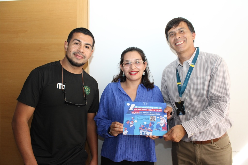 La Seremi del Deporte, Arling Guzmán, se reunió este lunes con Rodrigo Dorador, Director de Actividades Estudiantiles, y con Erick Araya, Jefe de la Unidad de Actividad Física y Deportes, ambos de la Universidad de Atacama, para que los profesores y estudiantes de la UDA sean agentes activos de la Consulta Ciudadana sobre la Actualización de la Política Nacional de la Actividad Física y Deporte que está implementando el Ministerio del Deporte e Instituto Nacional de Deportes.