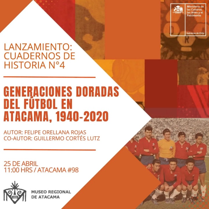 El 25 de abril, en el Marco del Mes y Día del Libro y del derecho de autor, Se realizará la presentación del Cuaderno de Historia del Museo Regional de Atacama «. Generaciones Doradas del Fútbol de Atacama». Dicha actividad será a las 11.00 horas en la Biblioteca Patrimonial del Museo. Los asistentes, recibirán un ejemplar del Cuaderno de Historia, en versión PDF.