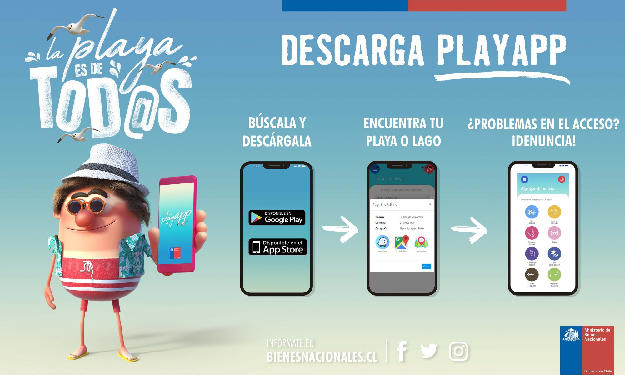 En el marco de la campaña “La playa es de tod@s”, el ministro de Bienes Nacionales, Julio Isamit, lanzó una nueva aplicación móvil denominada “Playapp”, la que permitirá a los usuarios buscar las playas de Chile, identificar sus accesos autorizados y realizar denuncias cuando existan accesos restringidos.