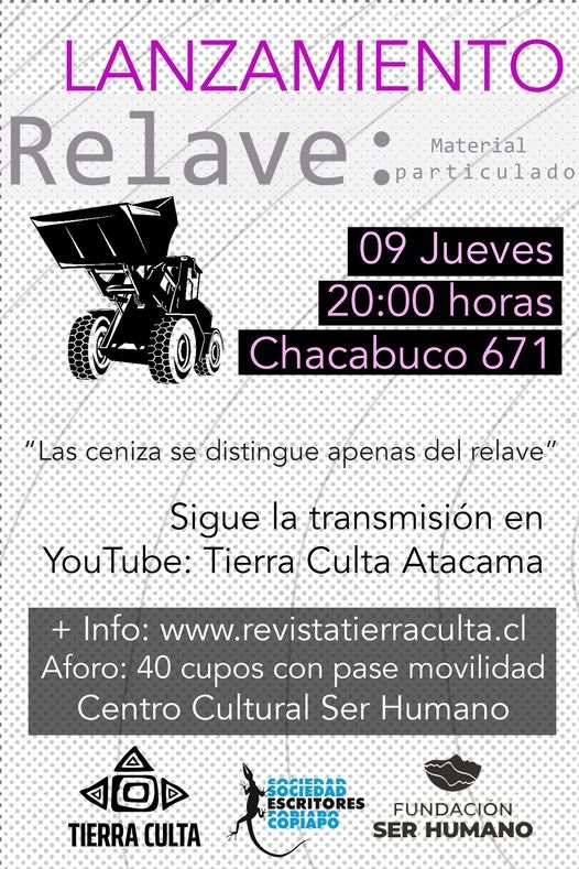 Relave es una publicación de Tierra Culta Ediciones donde el poeta de Flamenco, Vicente Rivera Plaza, nos habla del extractivismo desde la poesía.