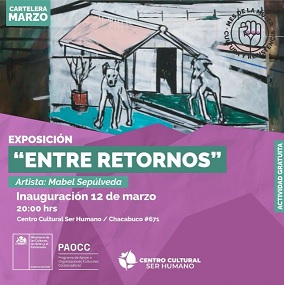 La destacada artista visual Mabel Sepúlveda invita a la comunidad a la inauguración de su nueva exposición, «Entre Retornos», que se llevará a cabo hoy miércoles 12 de marzo a las 20:00 horas en la Sala de Artes Visuales del Centro Cultural Ser Humano, ubicado en Chacabuco 671.