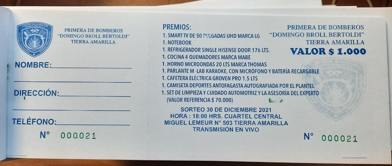 Mañana jueves 30, a contar de las 18.30 horas, en su cuartel central, y vía on line tendrá lugar la Rifa que ha organizado la Primera Compañía de Bomberos de Tierra Amarilla, a fin de reunir recursos que requiere la entidad para el servicio a la comunidad.
