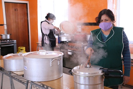 En el sector se reparten más de 200 almuerzo que en gran parte son repartidos a domicilio de los vecinos más longevos. Alejandra Olivares es voluntaria para entregar las raciones a domicilio y lamentó que “hay mucha gente que en este momento no tiene trabajo que la está pasando mal o están enfermos”.                                                                                                                          Con su característica alegría, la presidente de la Junta de Vecinos Participación y Desarrollo Sexta Etapa Los Minerales, Cecilia Campillay detalló que desde las 7 de la mañana se comienza con los porotos que fueron dejados a remojar de un día para otro.