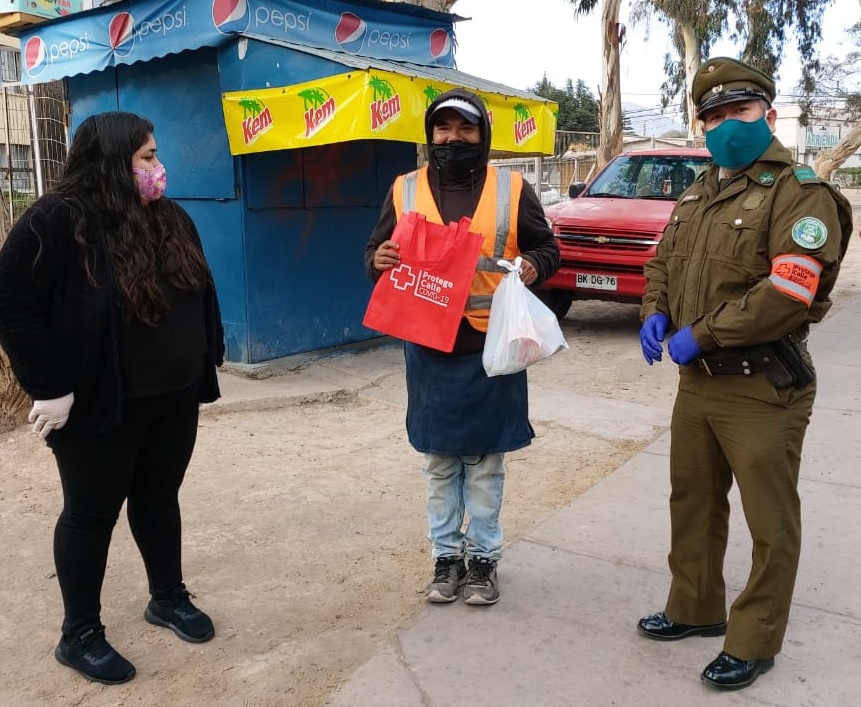 Los contagios por Coronavirus se incrementan a diario, por este motivo Carabineros a través del personal de la Oficina de Integración Comunitaria, de la 2ª. Comisaría Copiapó, junto a profesionales de la Universidad Santo Tomás están recorriendo aquellos sectores donde residen las personas en situación de calle, con el objeto de distribuir los kits de alimentos e higiene del plan “Ruta Protege Calle 2020”, de la Seremi de Desarrollo Social y Familia.