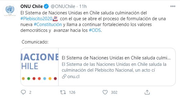 La Organización de las Naciones Unidas en Chile saludó la realización del Plebiscito Nacional y destacó «la alta participación y el espíritu cívico demostrado»; asimismo señaló que «son muestra del fuerte compromiso de Chile con la democracia».