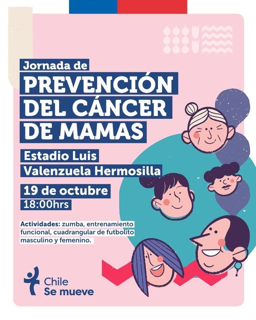 Este jueves, a las 18:00 horas, en el Estadio Luis Valenzuela Hermosilla, el Mindep-IND Atacama a través de su Área de Deporte de Participación Social, realizará un evento deportivo-recreativo de concientización sobre la prevención del Cáncer de Mamas, donde habrá zumba, entrenamiento funcional y un cuadrangular de fútbol femenino y masculino.