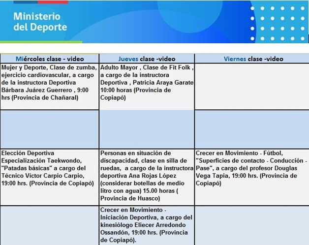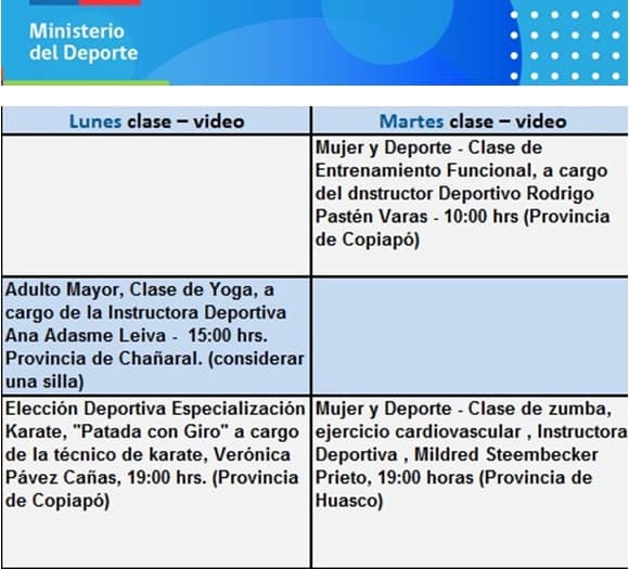 Compartimos con ustedes la programación de los talleres en vivo del Ministerio del Deporte e IND Atacama que se realizarán a partir del próximo lunes.