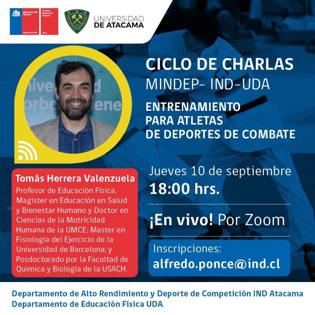 Hoy jueves 10 de septiembre, continúa el ciclo de charlas técnicas que realiza el Mindep-IND Atacama, en colaboración con la Universidad de Atacama (UDA), ahora con la conferencia enfocada en el “Entrenamiento de atletas en Deportes de Combate”, donde nuestra región ha destacado a nivel nacional e internacional, con las disciplinas de karate, taekwondo y judo.