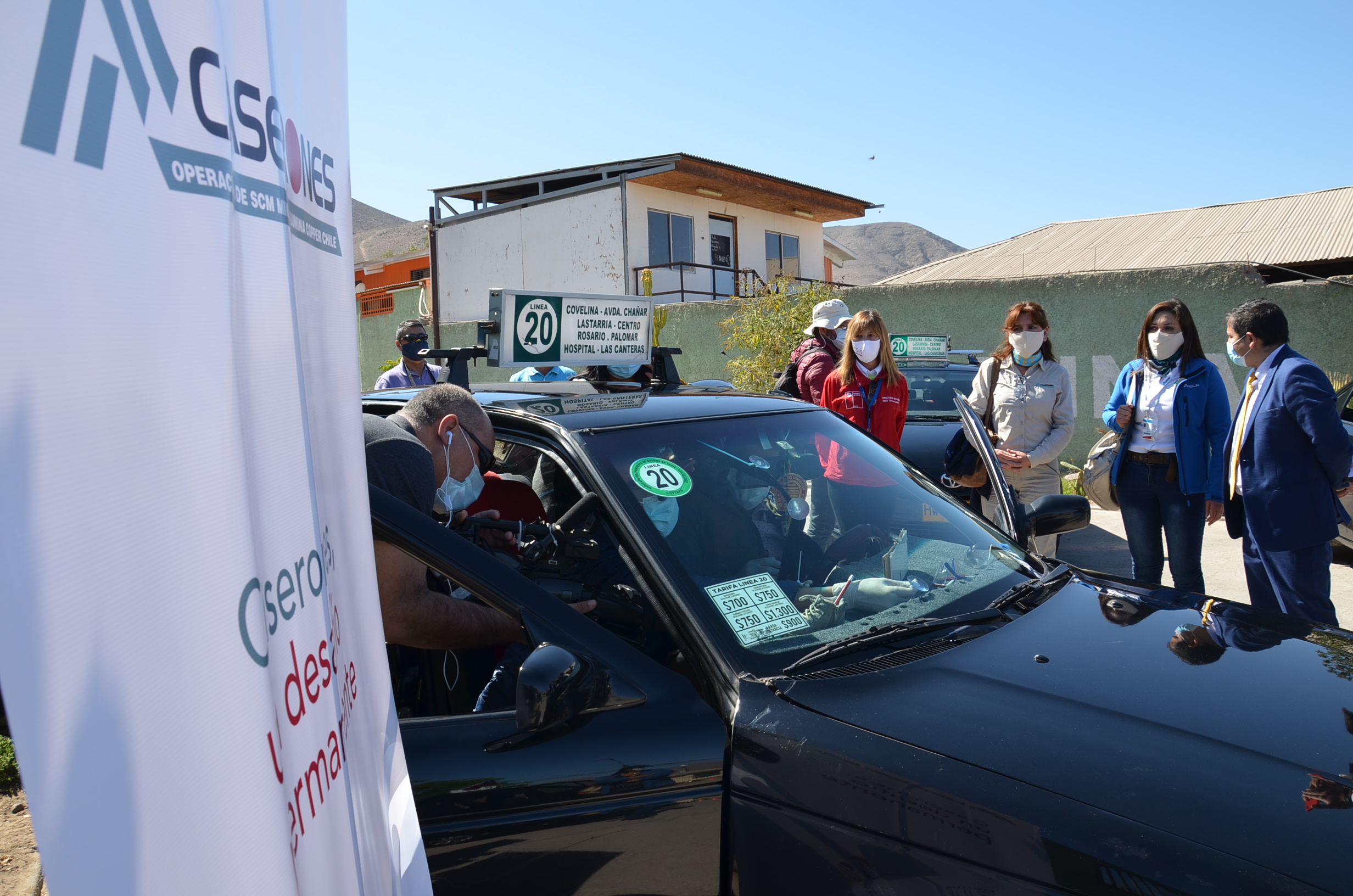 En la sede de la línea de taxis colectivos N°20 de Copiapó, se informó el proyecto “Separadores Preventivos”, iniciativa generada mediante el trabajo colaborativo entre Caserones de Minera Lumina Copper Chile y el Fondo de Solidaridad e Inversión Social (FOSIS), que permitió apoyar la confección de cortinas de PVC transparentes de una microempresaria local, para instalar en los vehículos de transporte público, para entregar mayor seguridad a pasajeros y conductores debido a la pandemia de Covid-19.