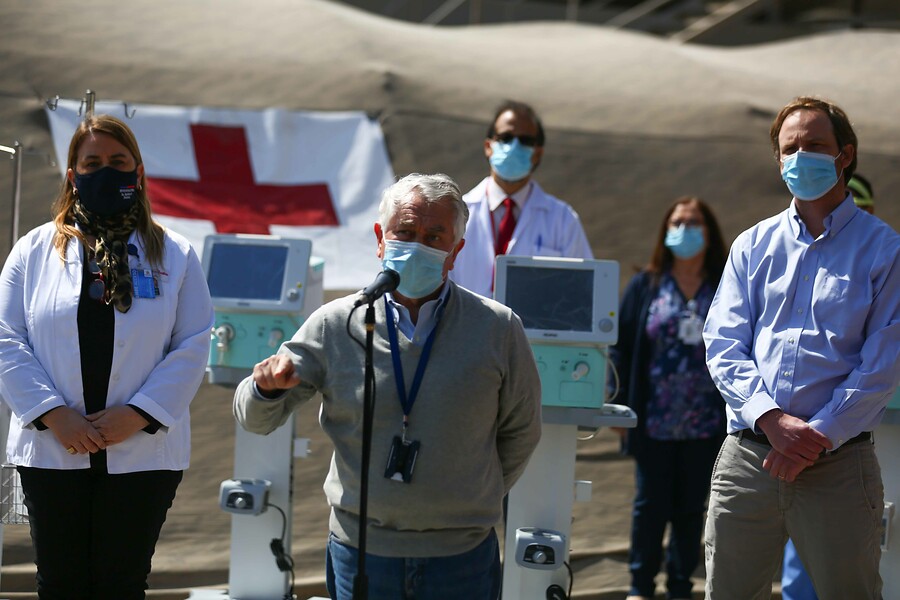 El ministro Enrique Paris, junto al subsecretario de Redes Asistenciales, Arturo Zúñiga, en Arica, el Ministerio de Salud informó que se inscribieron 100 nuevas muertes por Covid-19 en el Registro Civil, con lo cual el total de fallecidos llegó a 6.881, de acuerdo a los nuevos criterios para llevar la cuenta de los decesos.