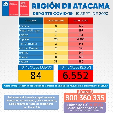 El Ministerio de Salud informó ayer sábado que Atacama presentó un total de 84 nuevos casos positivos de contagios de Coronavirus.