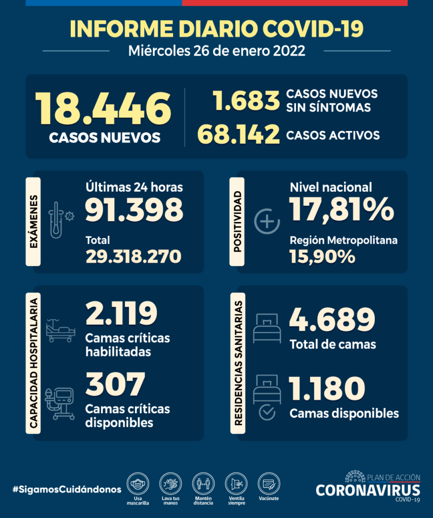 El Ministerio de Salud informa 18.446 casos nuevos de COVID-19, con una positividad de 17,81% en las últimas 24 horas a nivel nacional, con 91.398 exámenes, PCR y test de antígeno. La positividad diaria en la Región Metropolitana es de 15,9%.