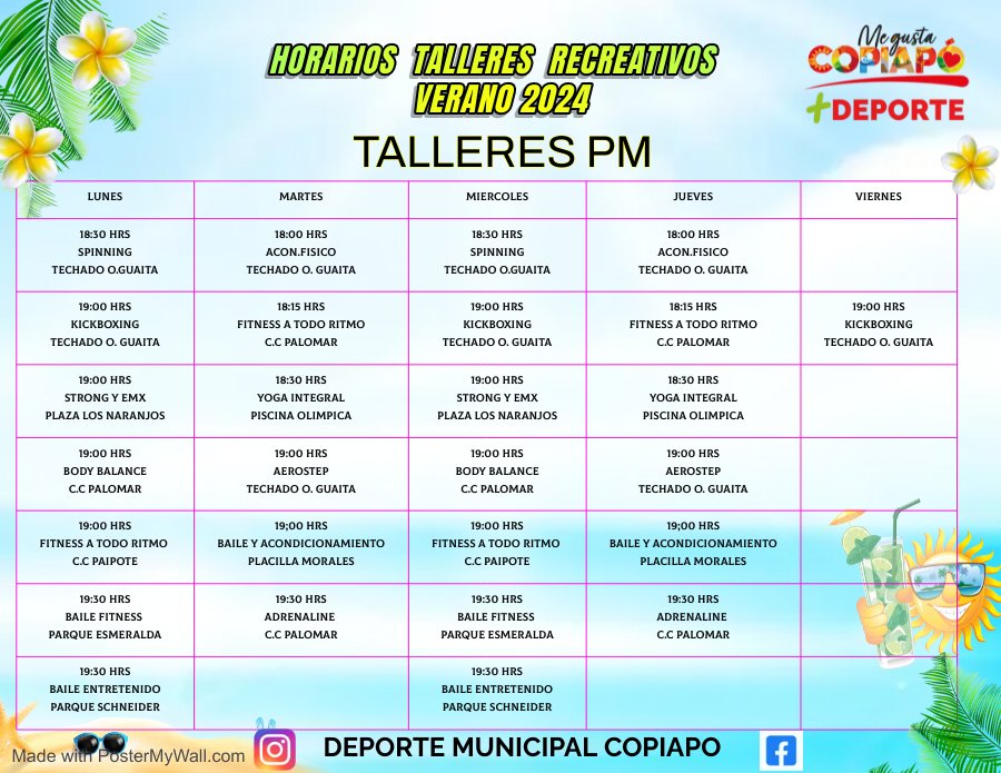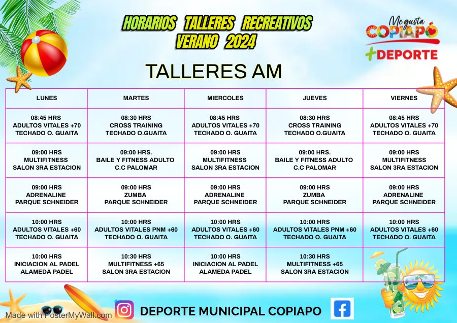 A través de sus redes sociales, la Municipalidad de Copiapó publicó los horarios de los talleres recreativos verano 2024. Estas actividades, que incluyen clases de zumba, acondicionamiento físico, baile entretenido, kick boxing, etc.
