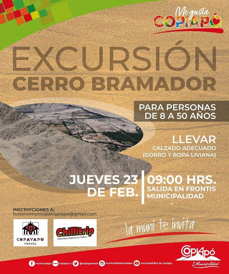 La Municipalidad de Copiapó, invitó a la comunidad a participar de una excursión al emblemático cerro de la capital regional, Cerro Bramador. La actividad será este 23 de febrero y contempla a personas entre los ocho y 50 años.