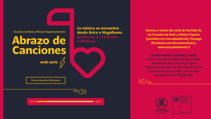 En días en que la música ha debido replegarse, una serie de artistas y músicos enviarán un agradecimiento a todos quienes están combatiendo el avance del coronavirus covid-19, a quienes levantan iniciativas solidarias con su comunidad, y a quienes han escuchado el llamado a quedarse en casa. Así nace “Abrazo de canciones”, un web serie de tres episodios que presenta el Ministerio de las Culturas, las Artes y el Patrimonio a través de su programa Escuelas de Rock y Música Popular, que se estrenará al mediodía del 5, 12 y 19 de julio por el canal de YouTube de las Escuelas de Rock, su fanpage en Facebook y en www.escuelasderock.cl.