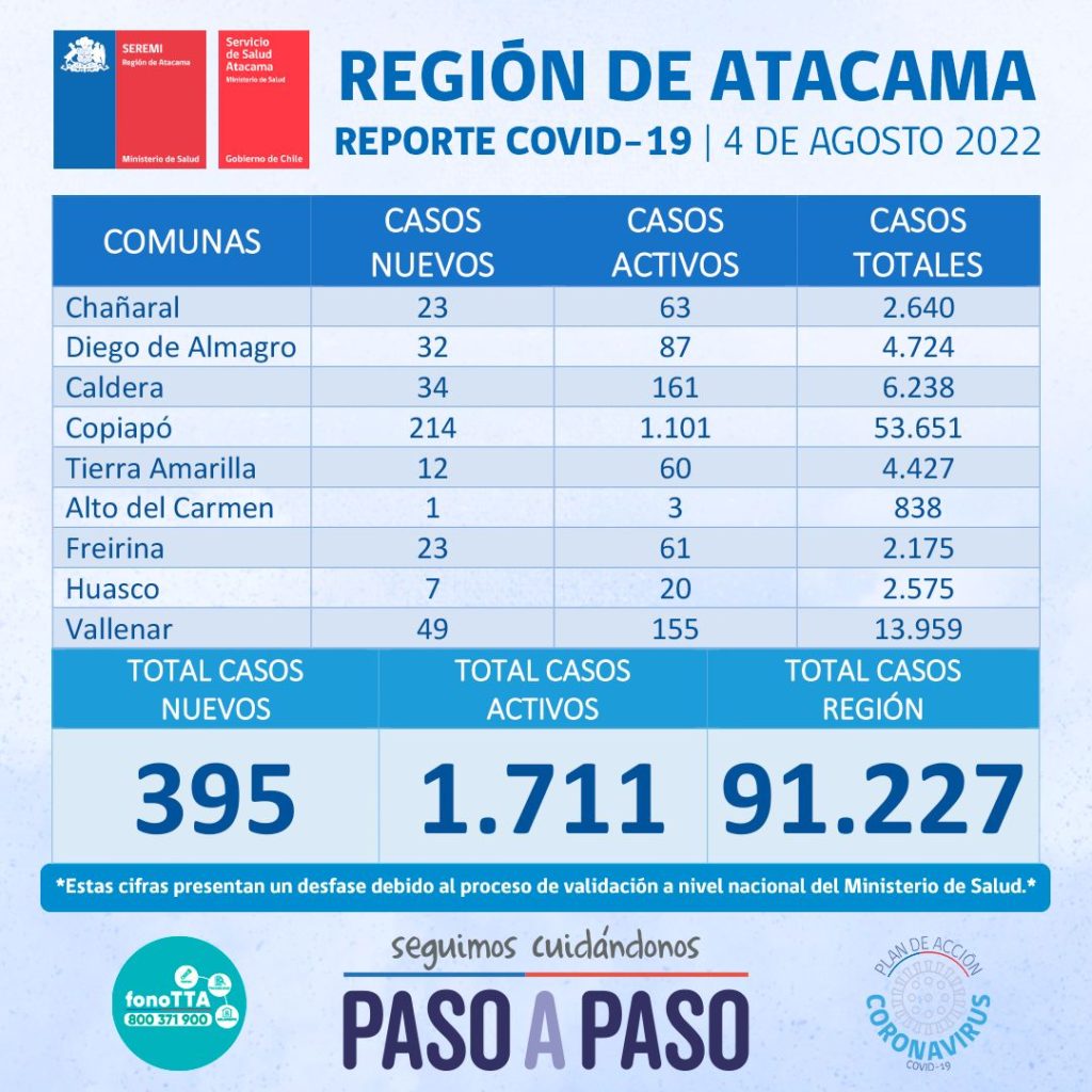 Este jueves 04 de agosto se reportan nuevos 395 casos positivos de Coronavirus en la región de Atacama. 214 casos corresponden a la comuna de Copiapó, 49 casos a la comuna de Vallenar, 34 casos a la comuna de Caldera, 32 casos a la comuna de Diego de Almagro, 23 casos a la comuna de Chañaral, 23 casos a la comuna de Freirina, 12 casos a la comuna de Tierra Amarilla, 7 casos a la comuna de Huasco y 1 caso a la comuna de Alto del Carmen.