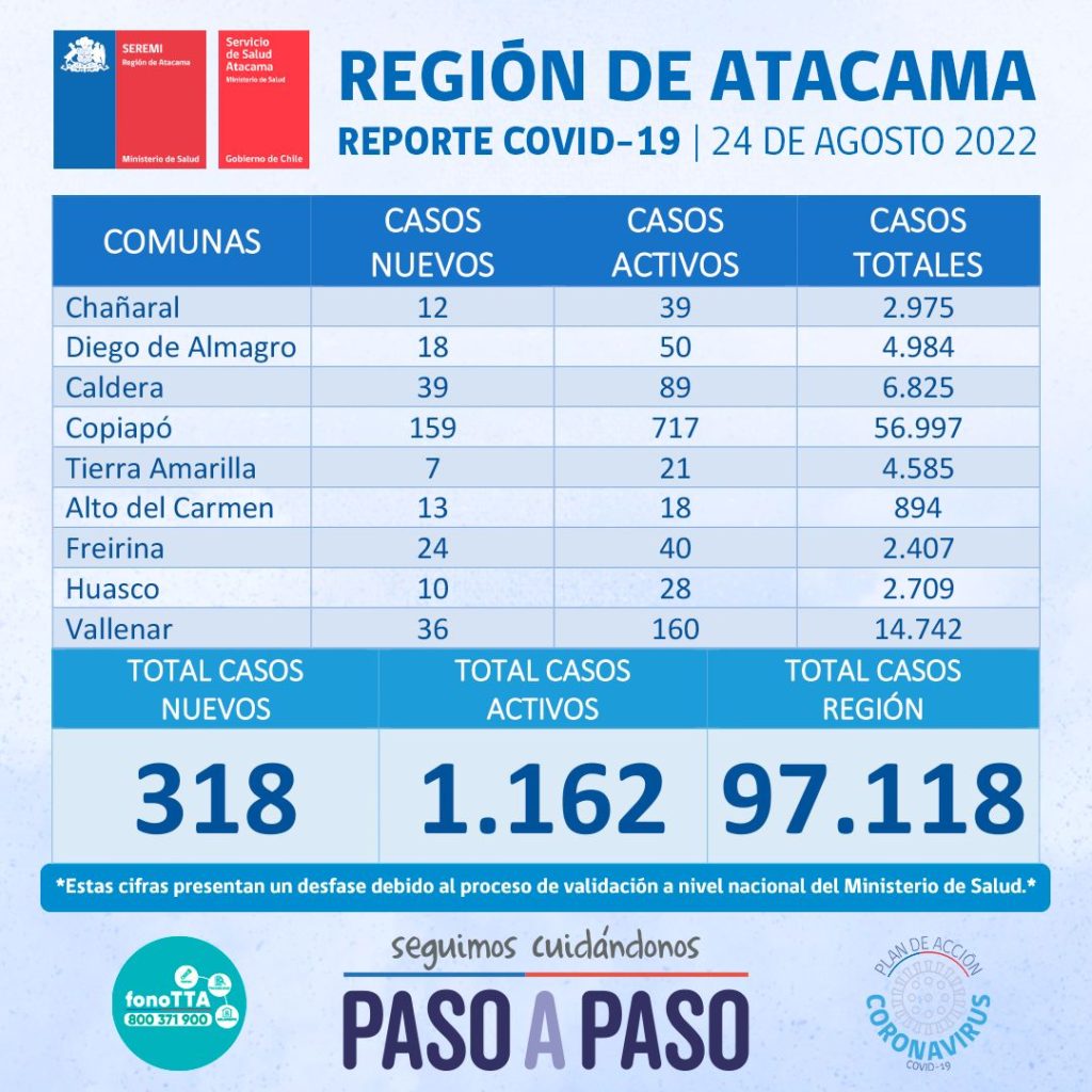 Este miércoles 24 de agosto se reportan 318 nuevos casos positivos de Coronavirus en la región de Atacama. 159 casos corresponden a la comuna de Copiapó, 39 casos a la comuna de Caldera, 36 casos a la comuna de Vallenar, 24 casos a la comuna de Freirina, 18 casos a la comuna de Diego de Almagro, 13 casos a la comuna de Alto del Carmen, 12 casos a la comuna de Chañaral, 10 casos a la comuna Huasco y por último, 7 casos a la comuna de Tierra Amarilla.