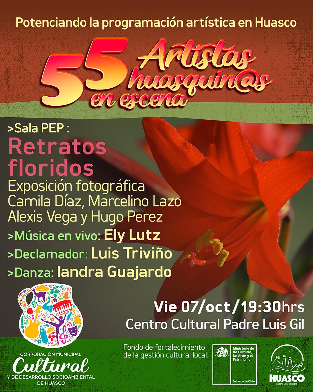 La Corporación Cultural Municipal de Huasco, como todos los primeros viernes de cada mes invita a presenciar «55 Artistas Huasquin@s en Escena». En esta instancia se conmemorará la solemne belleza natural de nuestro desierto florido con la inauguración de la muestra fotográfica «Retratos floridos» de Camila Díaz,