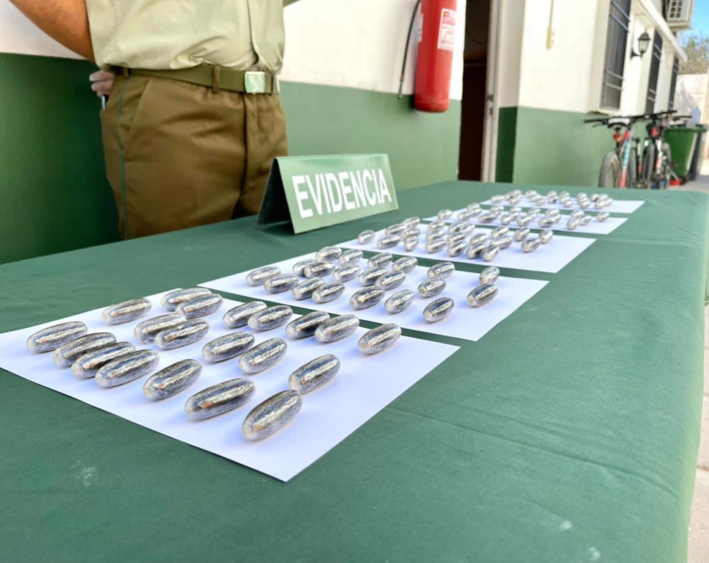 Según lo informado por el Jefe de la Sección O.S.7 Atacama, Capitán Eugenio Olea García, se trató de un trabajo durante la jornada de la tarde del día Lunes 15.03.2021, a raíz de un control vehicular desarrollado en la Ruta 5 Norte, altura del Km. 906, al proceder a fiscalizar un bus interprovincial proveniente del Norte del país, con destino a la región Metropolitana, al realizar una inspección con el can detector de drogas FRODO, este da la alerta positiva a su guía que en el asiento N° 18, se mantenían sustancias Ilícitas establecidas en la Ley de drogas N° 20.000, específicamente desde una chaqueta, por lo que personal especializado, procedió a activar los protocolos de investigación, estableciendo que la vestimenta era de propiedad del ocupante de tal asiento, el cual en su interior mantenía oculto una bolsa de nylon transparente contenedores de un total de 101 cuerpos cilíndricos ovoides contenedores de clorhidrato de cocaína, se continúan diligencias de investigación estableciendo a un segundo ciudadano que continuaba en el trayecto hacia Copiapó seria el coordinador de la entrega de la sustancias ilícitas incautada en la ciudad de Caldera, procediendo a la detención de D.C.R de 28 y B.R.Y, de 32 años ambos de nacionalidad Boliviana, por el delito de tráfico de drogas.