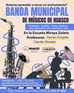 Ahora es su oportunidad de brillar con la Banda Municipal de Músicos de Huasco. La convocatoria es para ser parte de los talleres gratuitos para aprender trompeta, saxofón, flauta traversa, y más. Las clases son impartidas por los experimentados profesores Hernán Chepillo y Claudio Morales en la Escuela Mireya Zuleta. No dejen pasar esta experiencia única. Inscripciones al +569 7729 6648 al correo bandamusicoshuasco@gmail.com