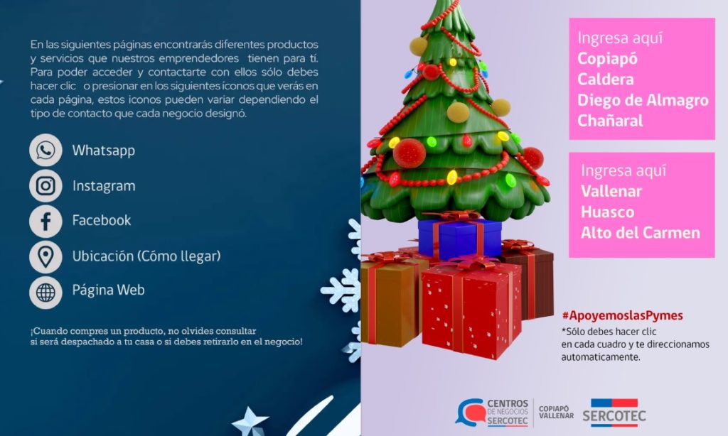 Cuando ya nos encontramos en la cuenta regresiva para las Fiestas de Fin de Año, los Centros de Negocios SERCOTEC de Copiapó y Vallenar han formulado un nuevo llamado a la comunidad para que visite el Catálogo de Navidad en el link https://navidad.cnsatacama.cl/ y prefieran comprar y contratar local, que regalemos a nuestros familiares y amistades apoyando a los emprendedores y emprendedoras de las comunas de Copiapó y Vallenar, que en tiempos de pandemia no la han pasado muy bien.