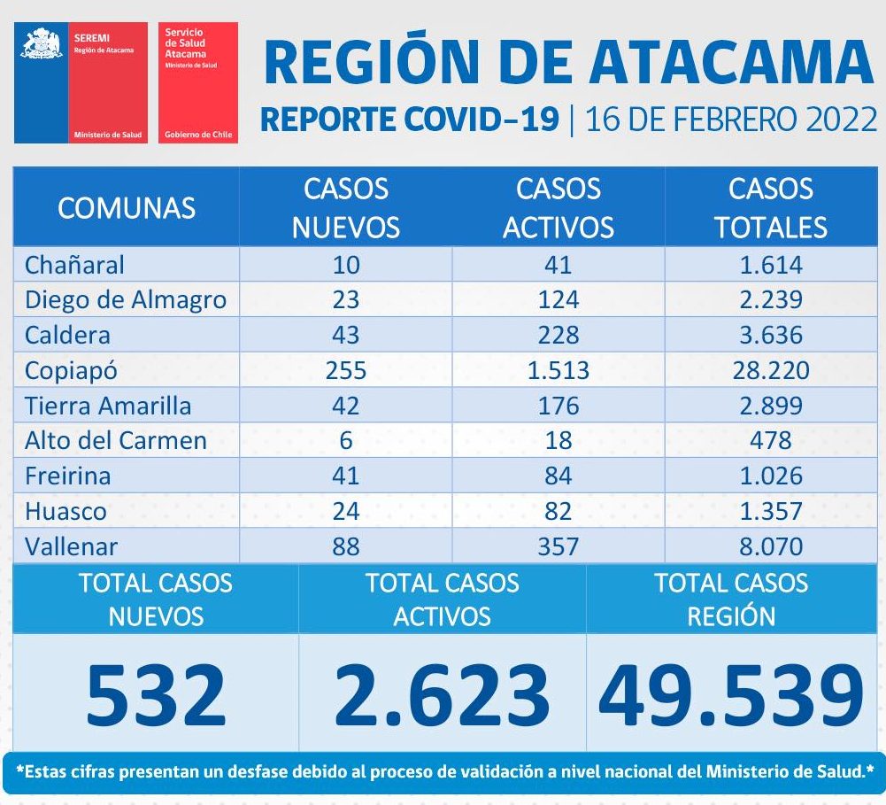 Este miércoles 16 de febrero se reportan 532 nuevos casos positivos de Coronavirus en la región de Atacama. 255 casos corresponden a la comuna de Copiapó, 88 casos a la comuna de Vallenar, 43 casos a la comuna de Caldera, 42 casos a la comuna de Tierra Amarilla, 41 casos a la comuna de Freirina, 24 casos a la comuna de Huasco, 23 casos a la comuna de Diego de Almagro, 10 casos a la comuna de Chañaral y 6 casos a la comuna de Alto del Carmen.